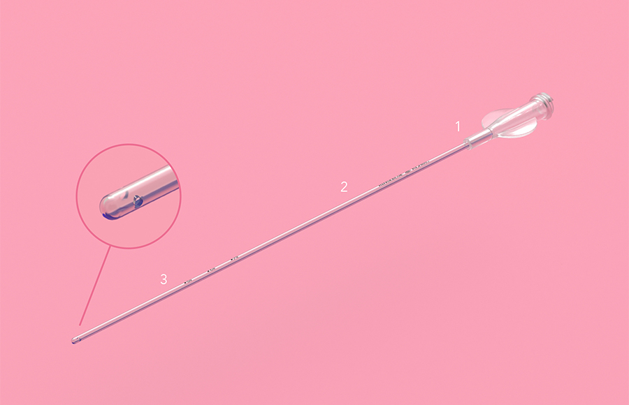 - una porzione distale morbida e flessibile (3) per un trasferimento seminale delicato e atraumatico;