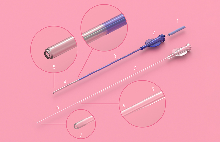 - un catetere introduttore azzurro (3) con scala di misurazione a 5,6,7,8 cm dalla punta;