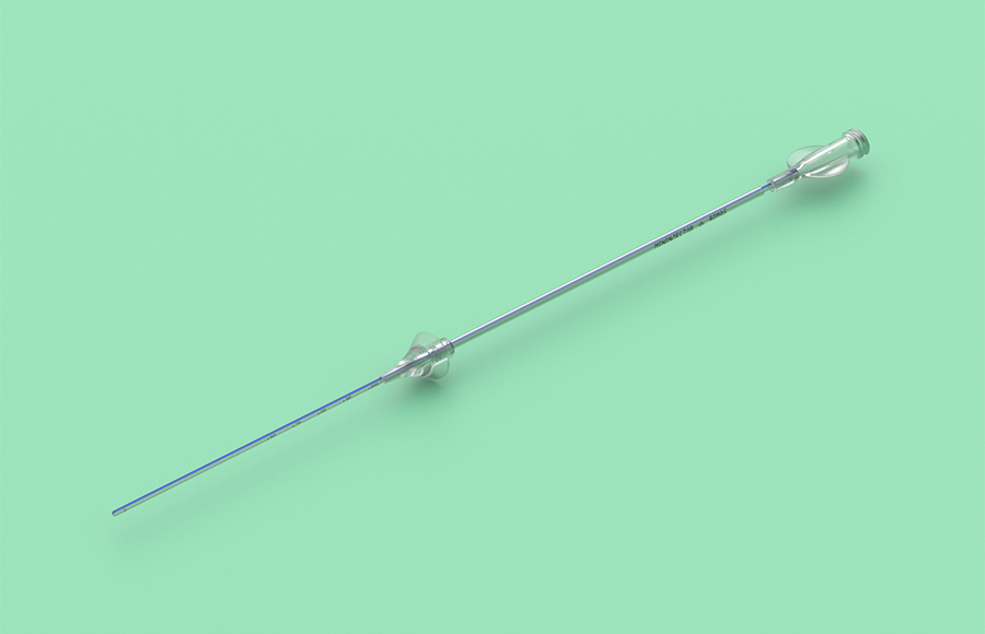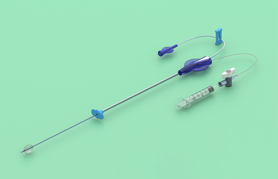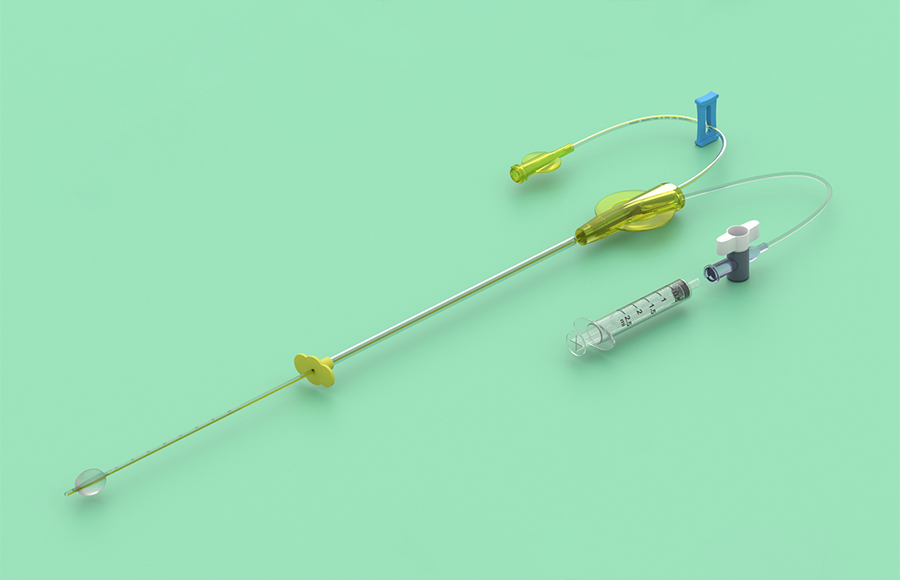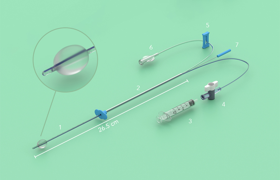 - un catetere semirigido radiopaco a 2 lumi (1) dotato di un palloncino ovale in gomma termoplastica da 2,5 ml sulla parte distale che assicura un alloggiamento stabile del catetere;